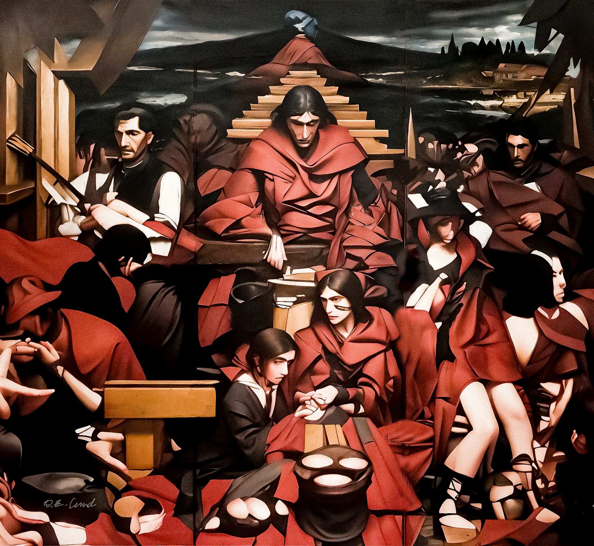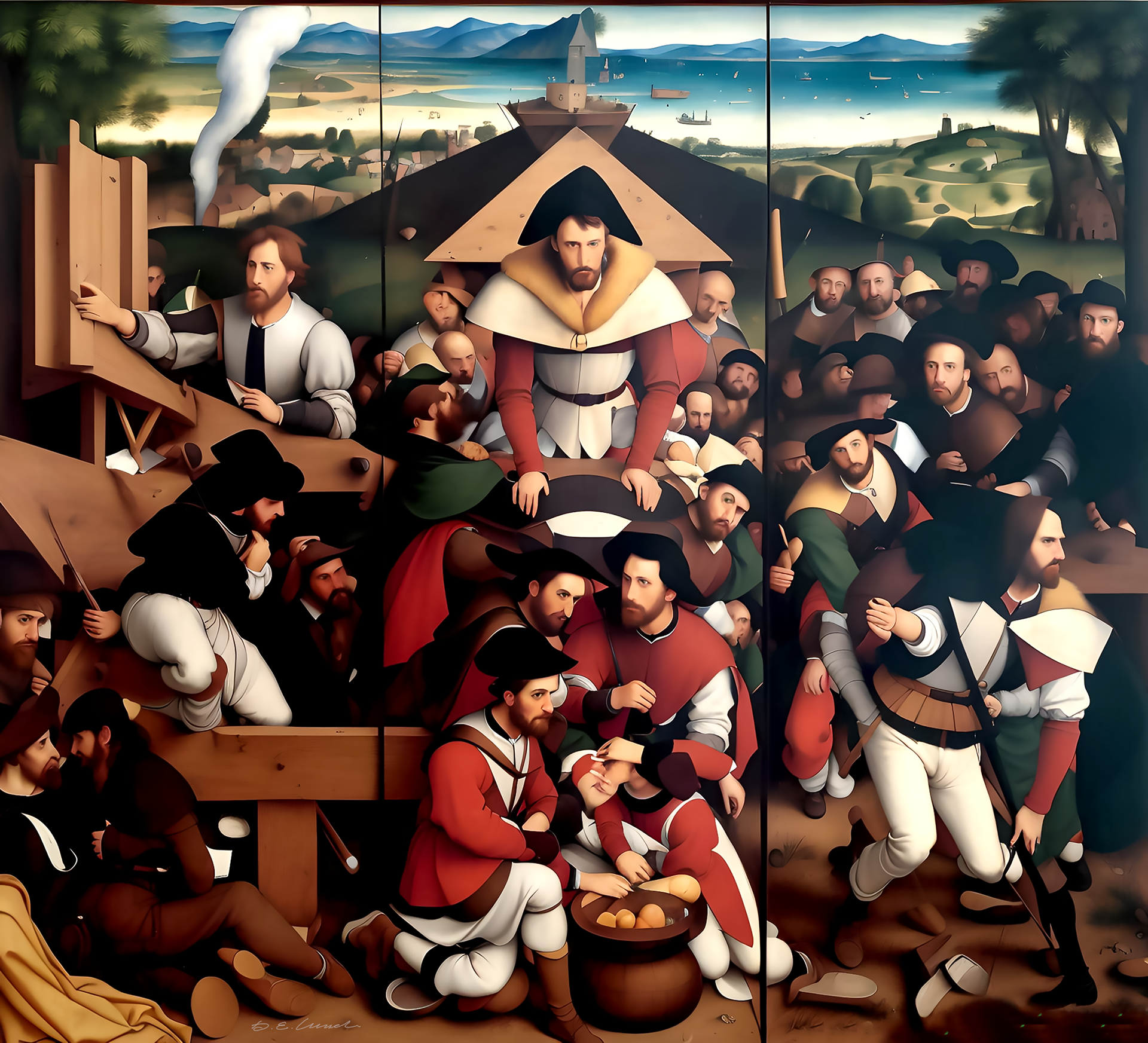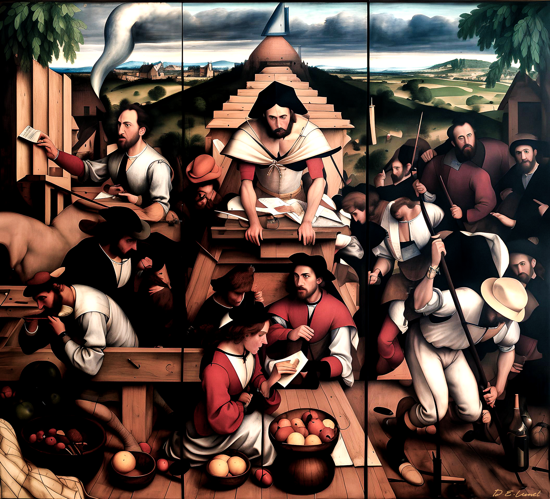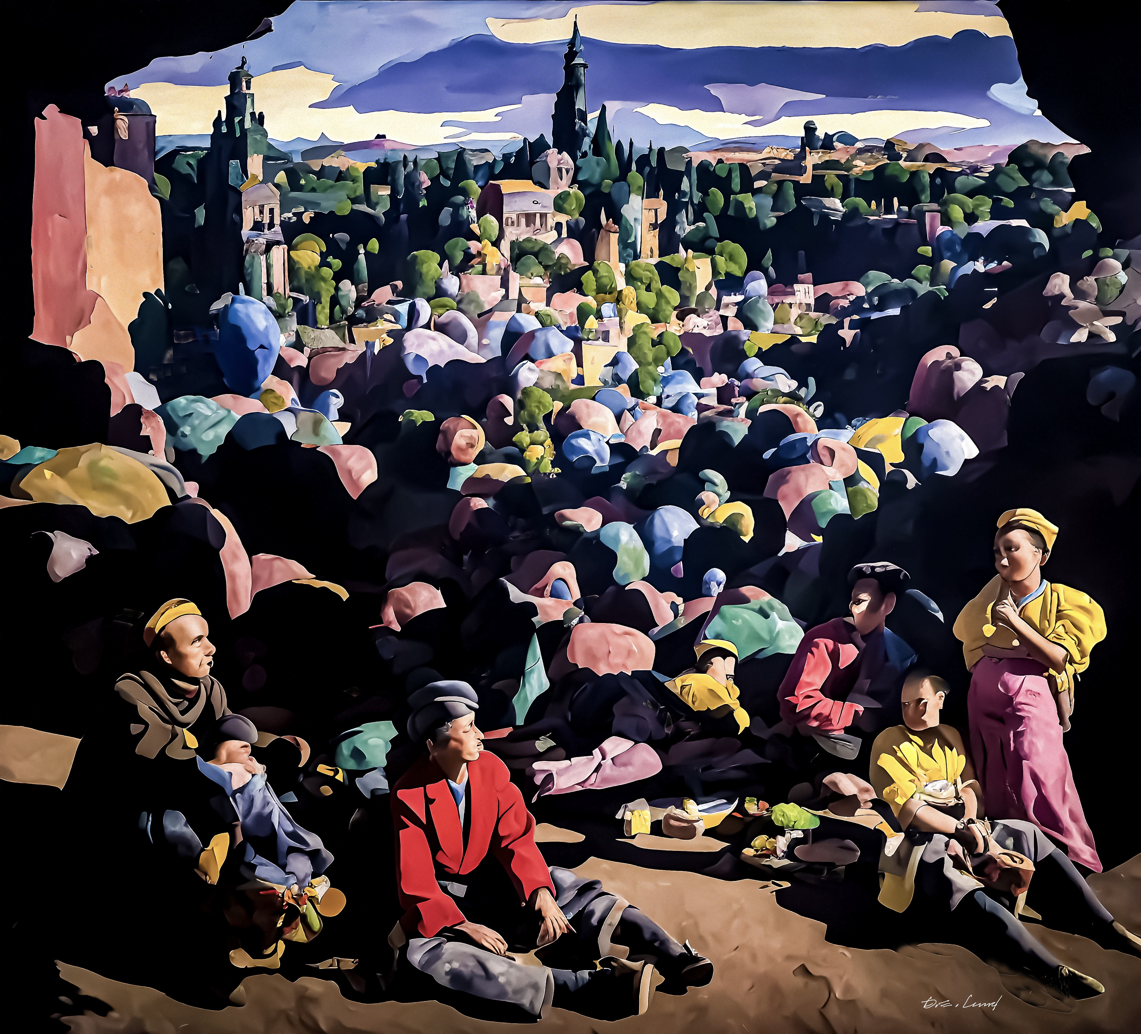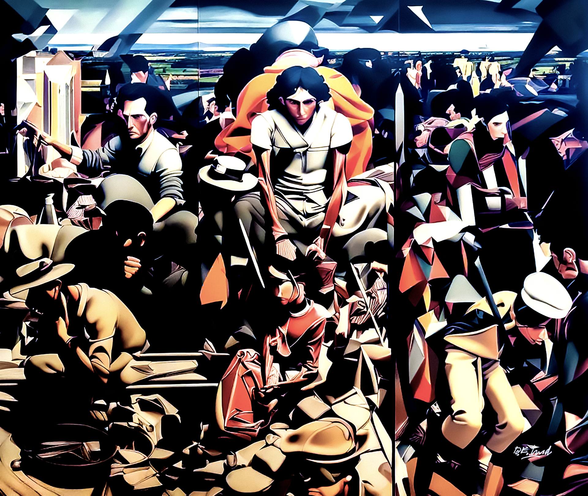 Image to Image multiple regenerations from Lund painting "Homage to Rivera": Tryptych, oil on canvas 58"x 72". Shown top left. Differing text prompts and Photoshop painting and editing.