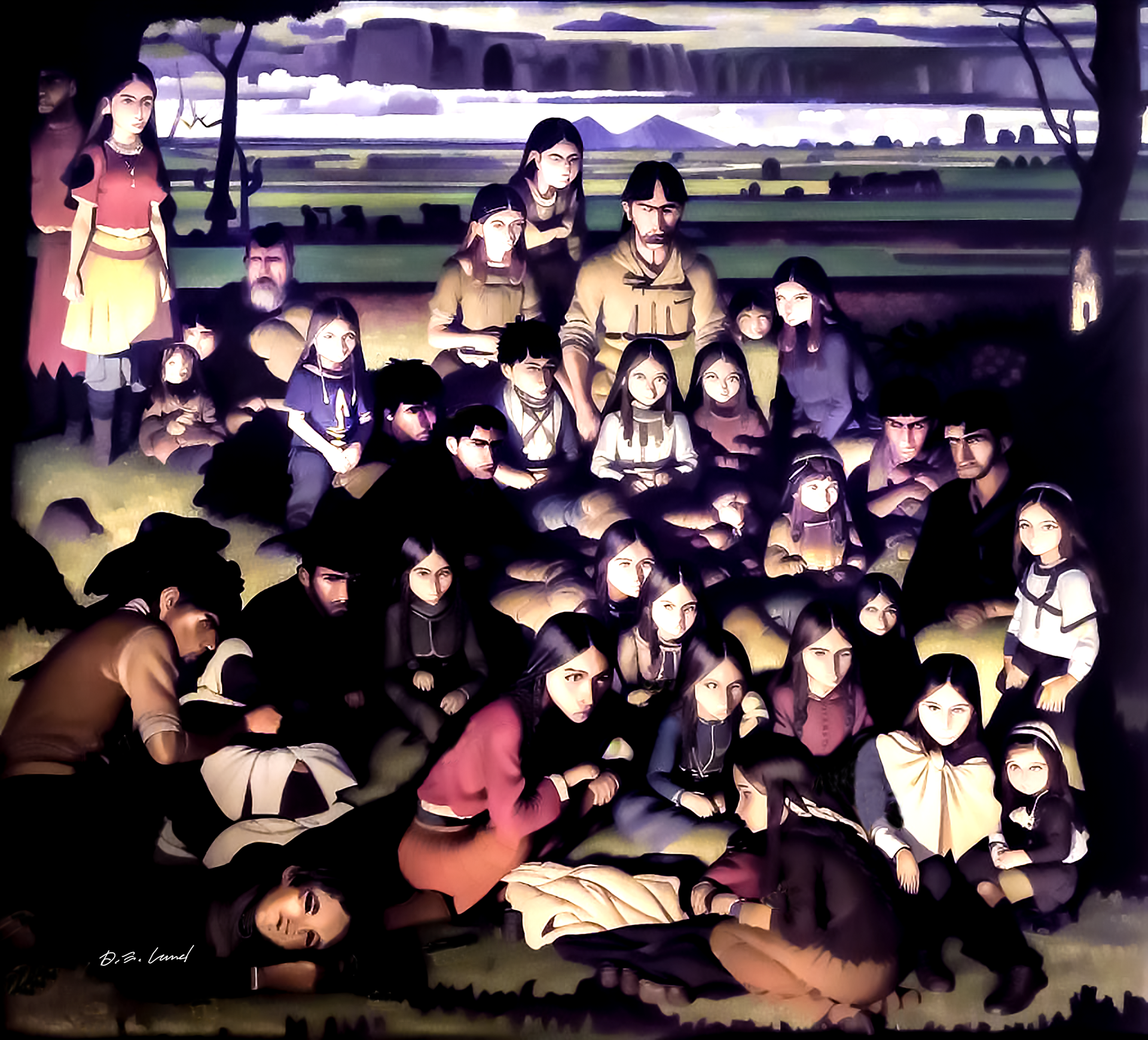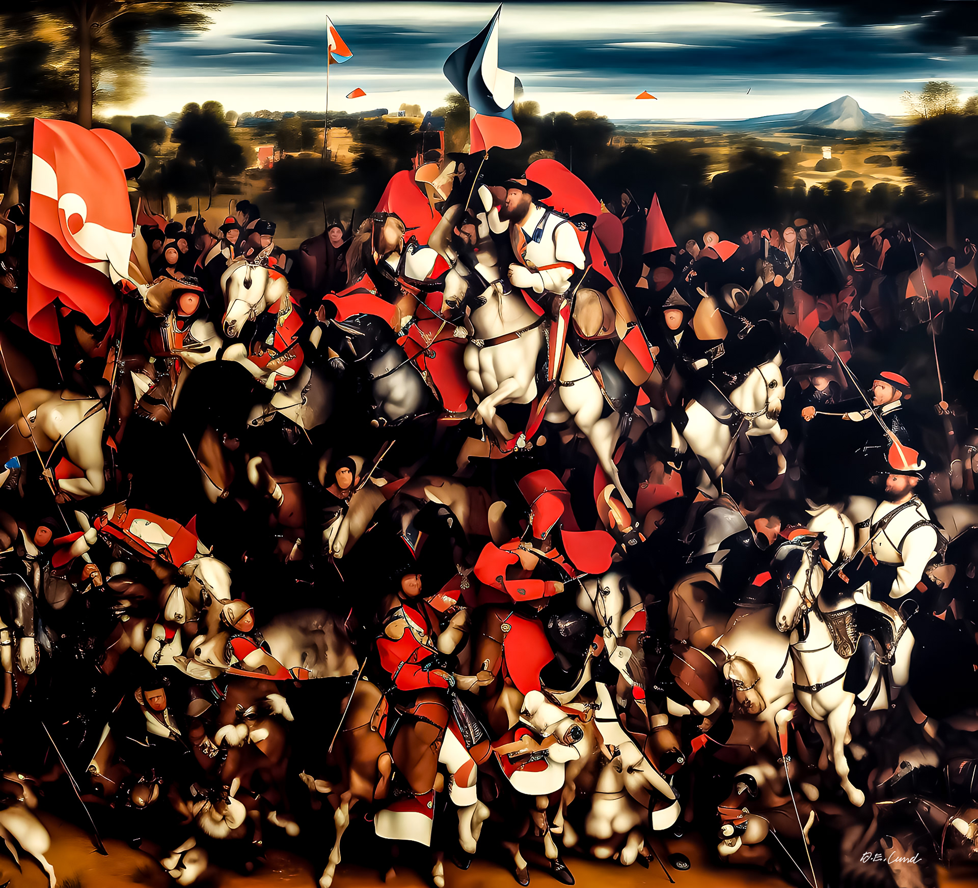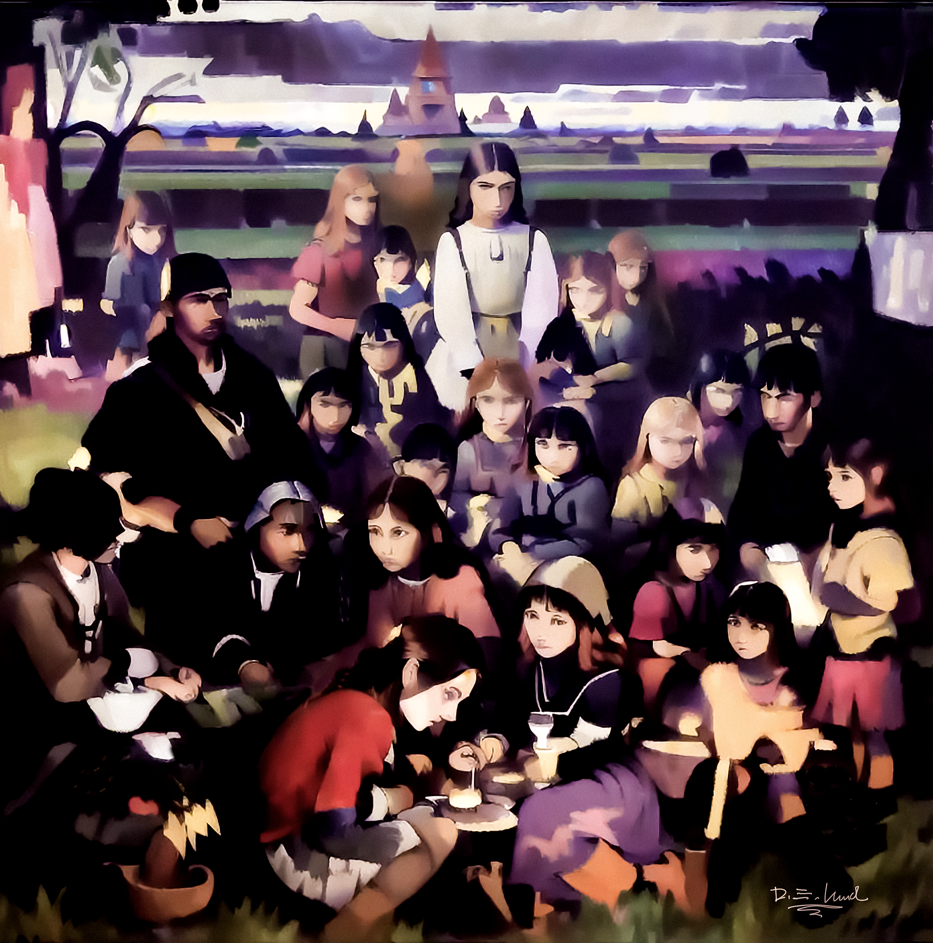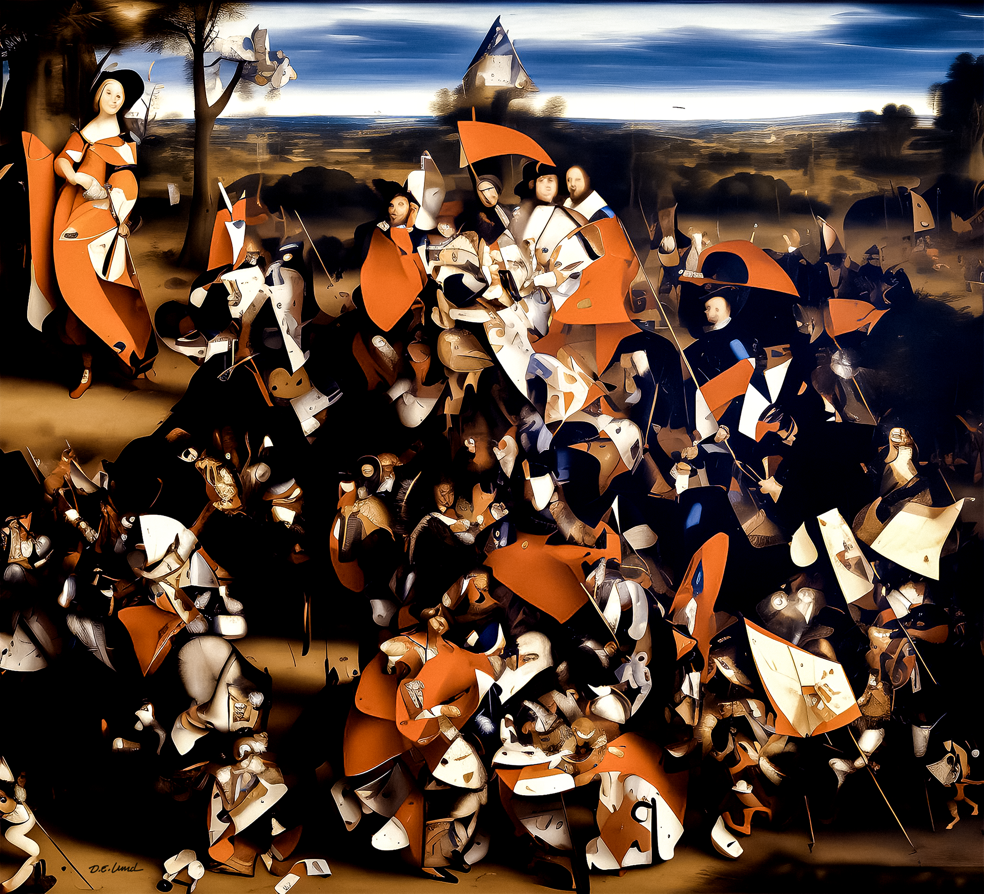 Image to Image multiple regenerations from Lund painting "Homage to Rivera": Tryptych, oil on canvas 58"x 72". Shown top left. Differing text prompts and Photoshop painting and editing.