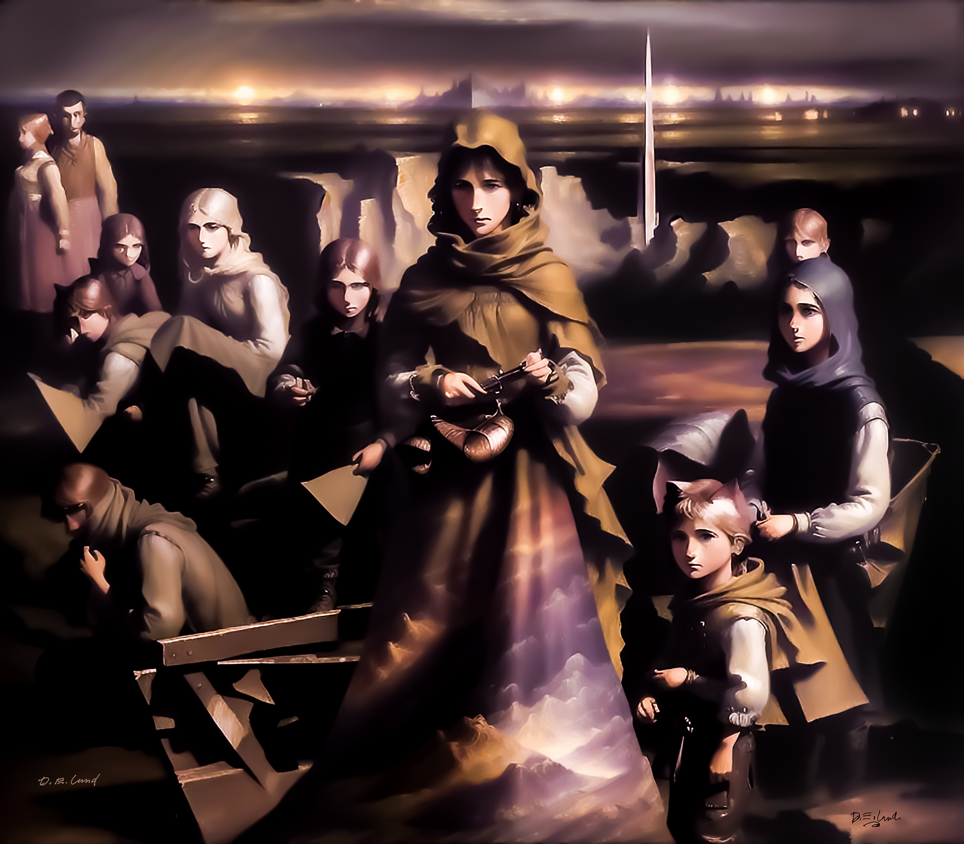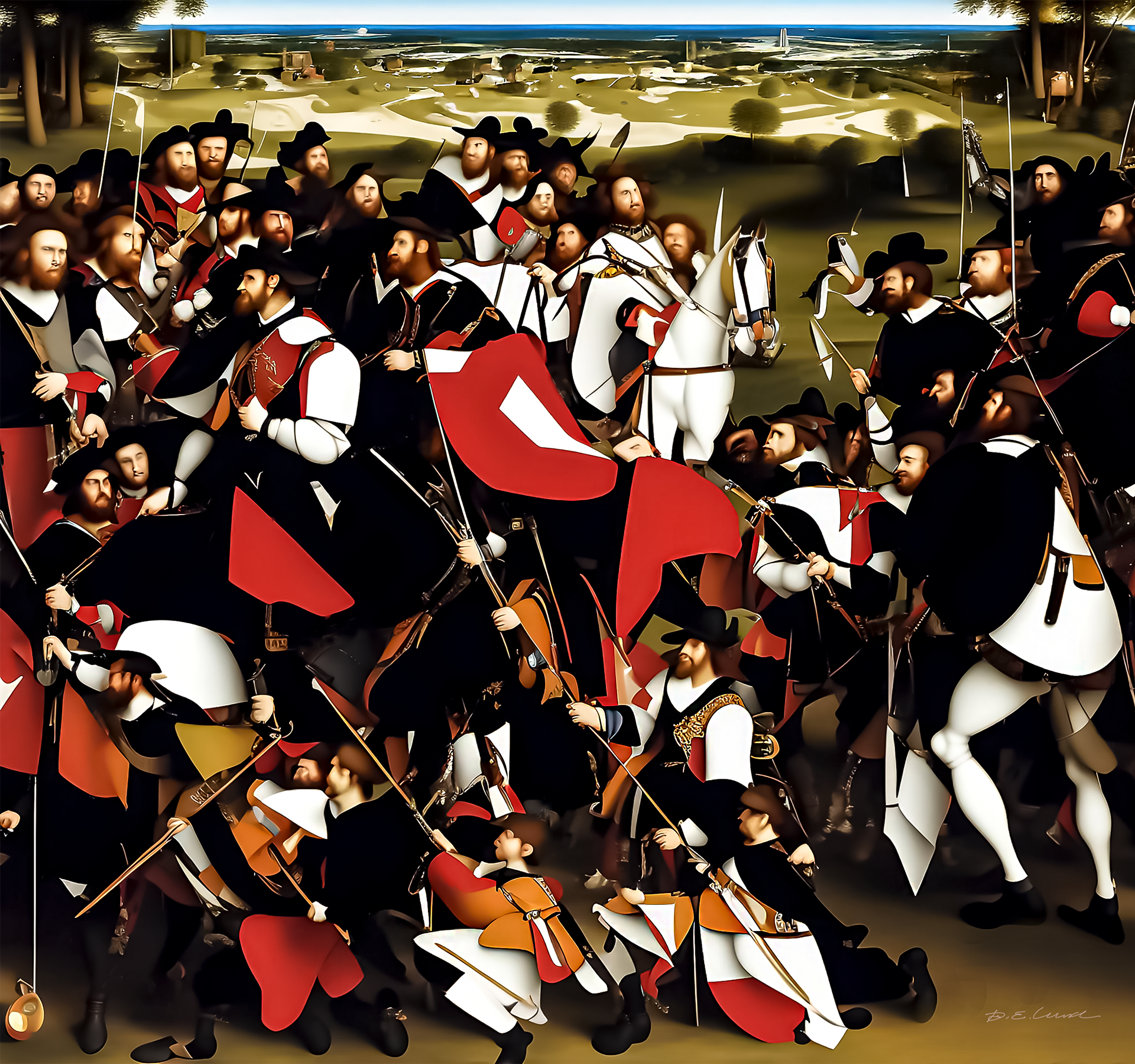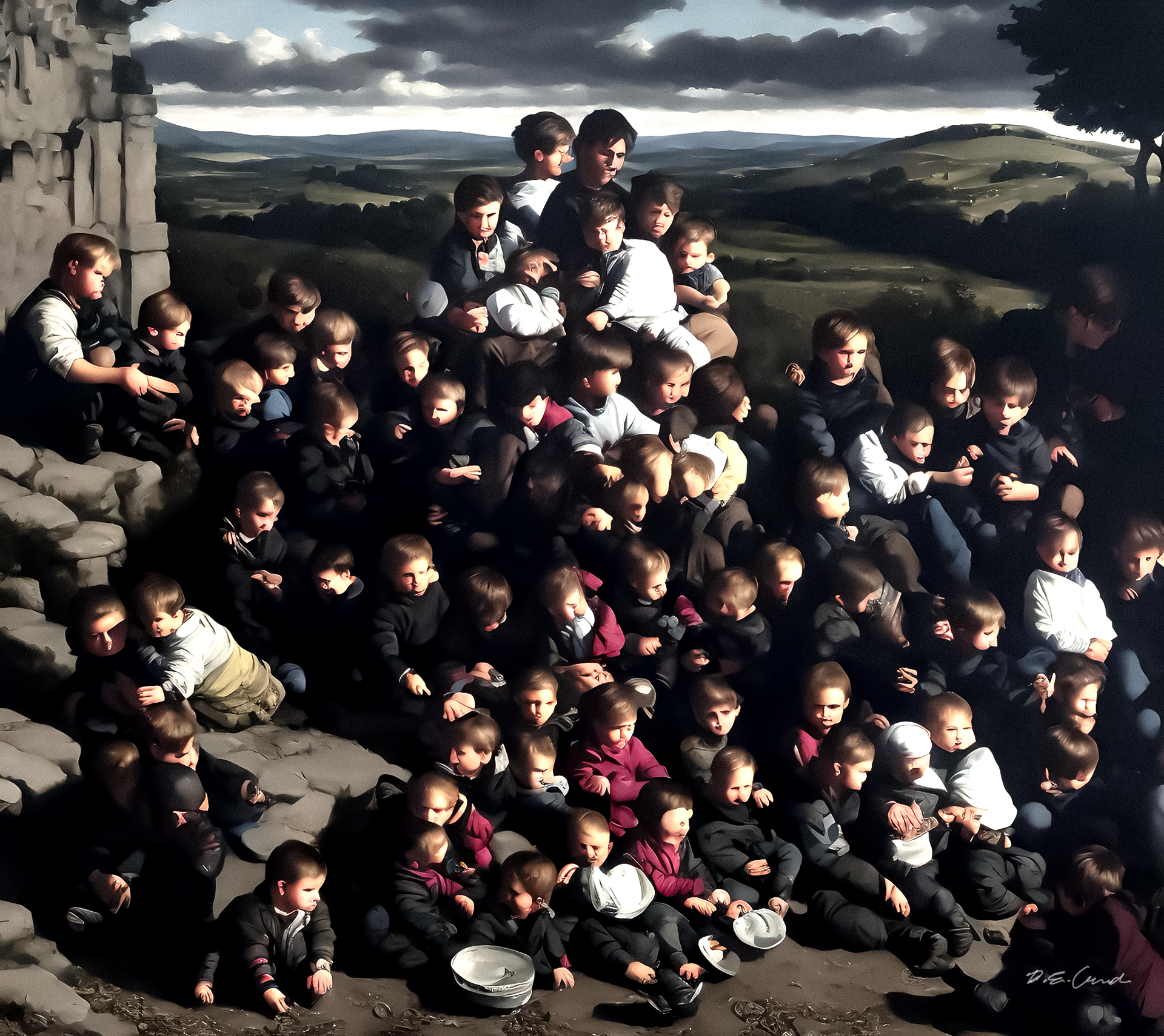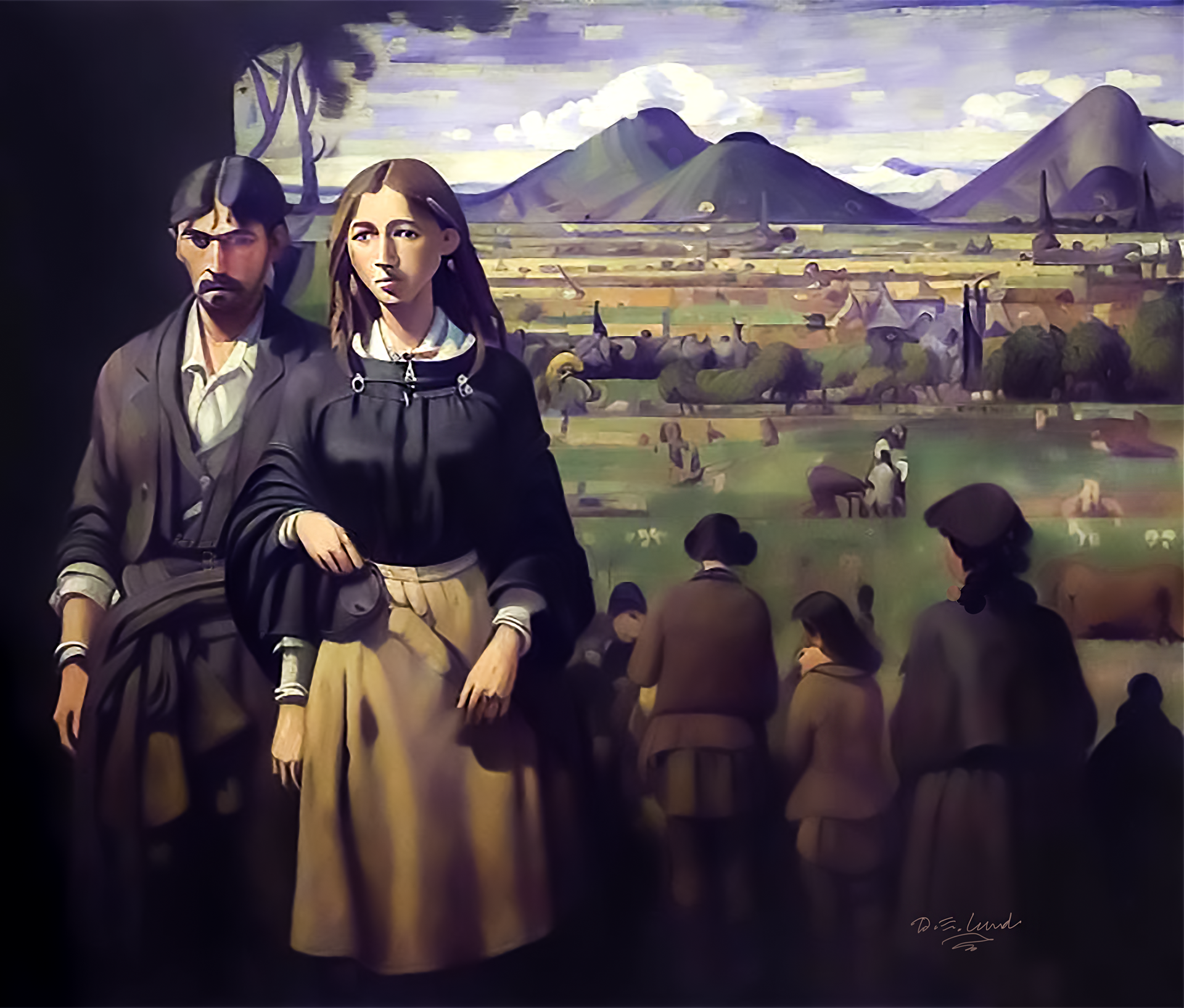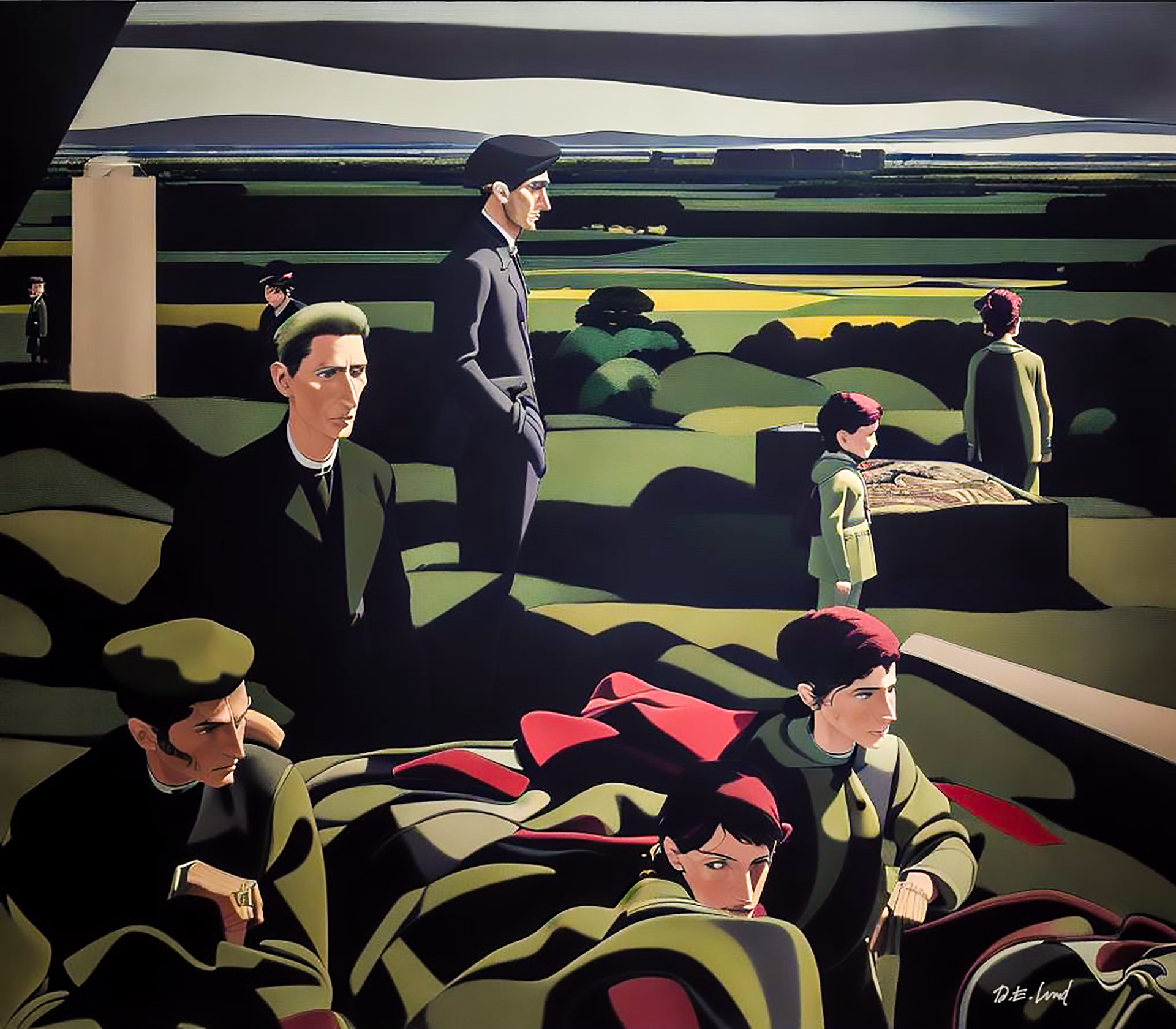 Image to Image multiple regenerations from Lund painting "Homage to Rivera": Tryptych, oil on canvas 58"x 72". Shown top left. Differing text prompts and Photoshop painting and editing.